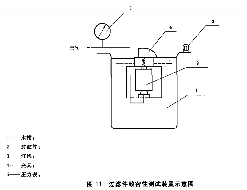 打開水槽的燈,向水槽內(nèi)注水,水面應(yīng)浸沒過濾件,過濾件頂部距離水面2 cm。將被檢驗的過濾件夾到ZHUAN用夾具內(nèi),夾緊過濾件;打開空氣開關(guān),調(diào)整壓力,使進入過濾件內(nèi)的空氣壓力為(15±2)kPa;將夾有過濾件的夾具浸入水槽內(nèi),保持1 rain,轉(zhuǎn)動和傾斜過濾件,觀察有無氣泡逸出。