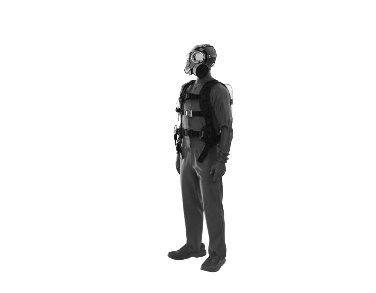 1、選擇一套適合人體模型胸圍尺寸的防護服穿在人體模型上,并按照正壓式消防空氣呼吸器的使用說明,給人體模型正確佩戴正壓式消防空氣呼吸器,形成一個測試假人。